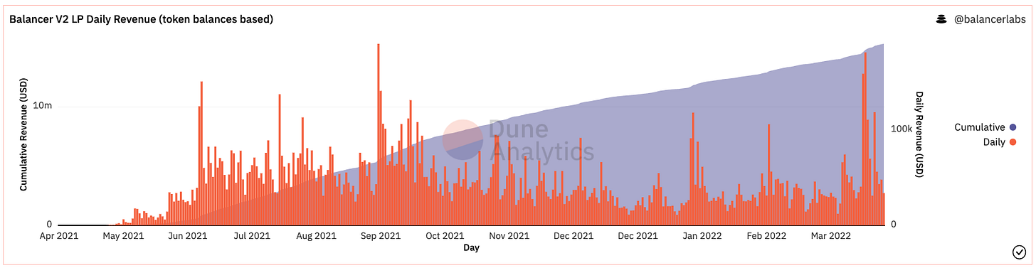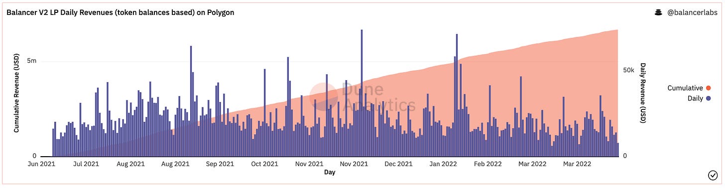 Daily LP revenues for Mainnet V2 averaged around $57k last week with daily LP revenue peaking at $118k on the 11th of April. Polygon daily LP revenue was on average at $13k.