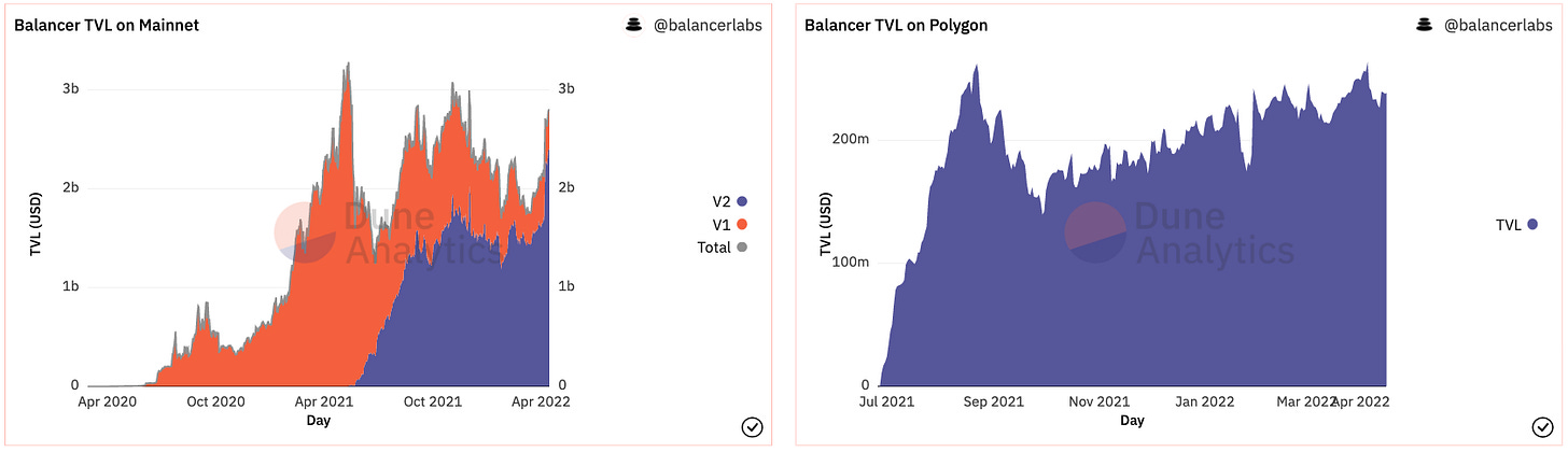 Mainnet V2 TVL currently sits at $2.4B up 5% from last week’s $2.28B. Balancer V2 Mainnet TVL continues to grow to new highs. Current overall Mainnet TVL sitting at $2.8B. Polygon TVL is at $238M up from last week’s $232M. TVL on Arbitrum increased to $77M from last week’s $76M.